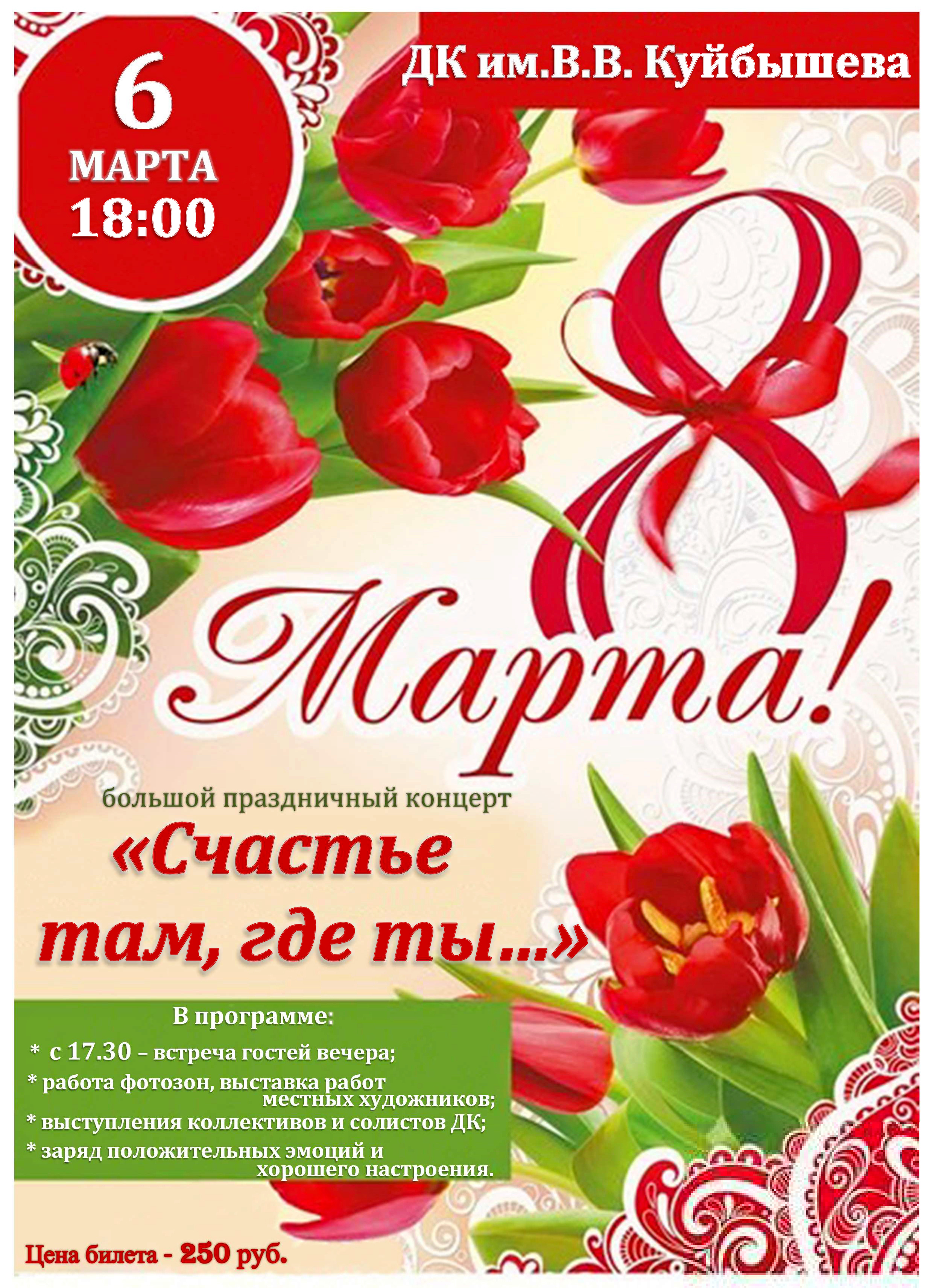 Праздничный концерт “Счастье там, где ты”, посвященный празднованию 8 Марта, состоится в Куйбышеве.