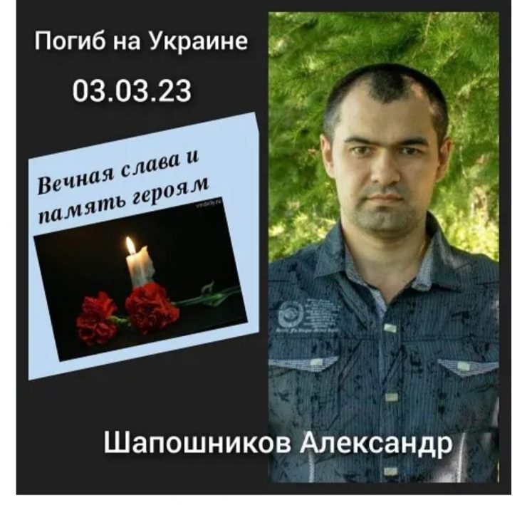 Шапошников Александр — первый погибший из мобилизованных ребят. Александр окончил ж/д училище. Работал в локомотивном депо ст. Барабинск. Был мобилизован 26 сентября 2022 года вместе со своим братом-близнецом Николаем.