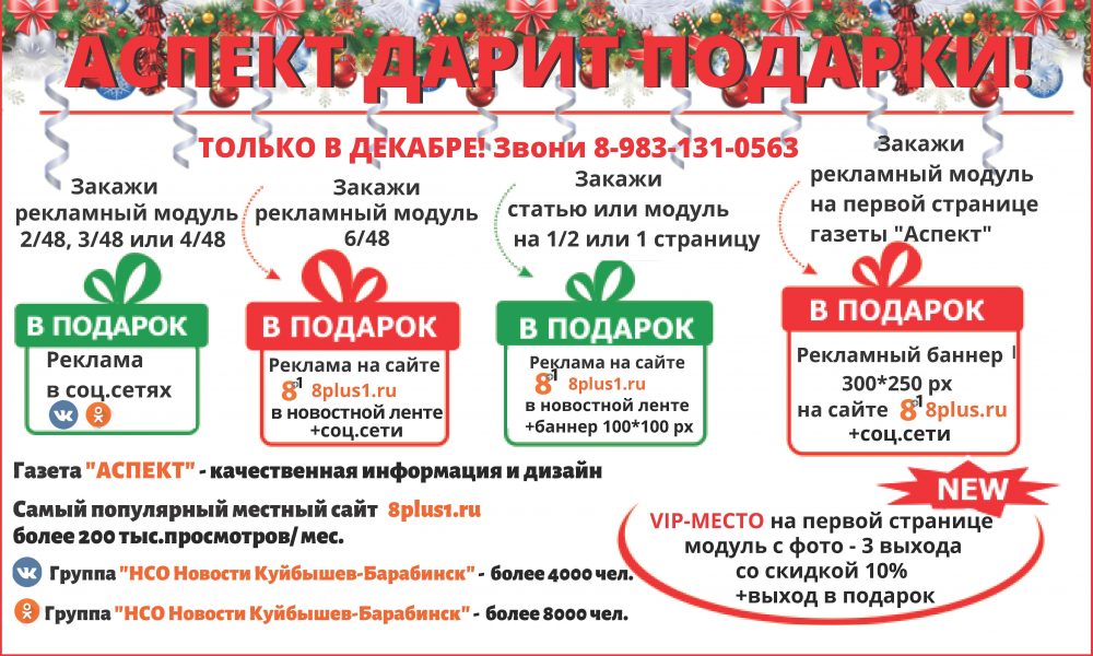 Только в декабре можно воспользоваться бонусами от редакции “Аспекта” при подаче рекламы в газету. Много подарков!
