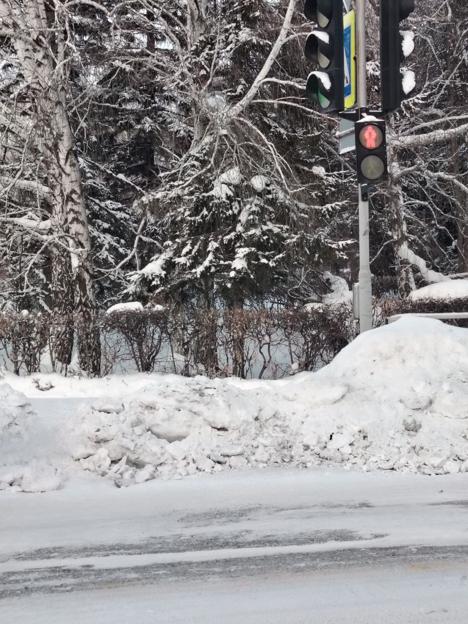 На светофоре выросли такие снежные брустверы, что переход дороги превратился в квест на выживание. Недавно наши читатели наблюдали картину: пожилая женщина пыталась «штурмовать» этот сугроб, чтобы просто перейти улицу. Пока бабушка преодолевала снежный вал, зеленый свет успел смениться на красный.