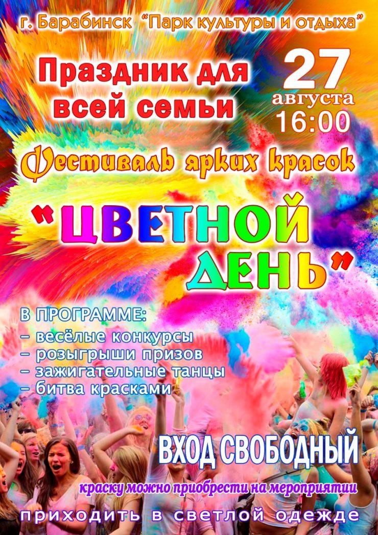 27 августа в 16.00 в Парке культуры и отдыха в Барабинске состоится фестиваль ярких красок “Цветной день”.