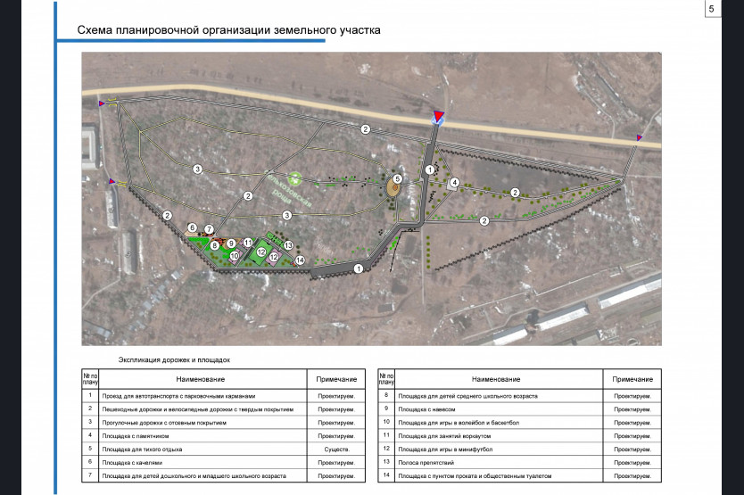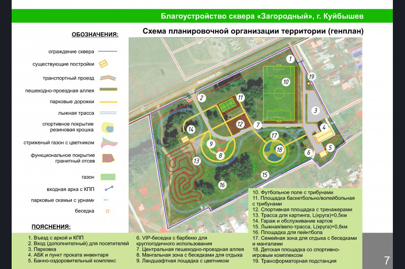 Проектом предусмотренно устройство центральной пешеходнщ-проездной аллеи, мангальной зоны с беседками для отдыха, ландшафтной площадки с цветником. Также будет обустроена спортивная площадка с тренажерами, трасса для картинга, лыжная велотрасса, а также футбольное поле с трибунами.