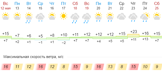 Так 13 мая днём ожидается, что термометр покажет около +7°С. Во вторник, 14 мая,также будет не тепло +6°С. В среду, 15 мая, температура воздуха днём опустится еще на градус +5°С.