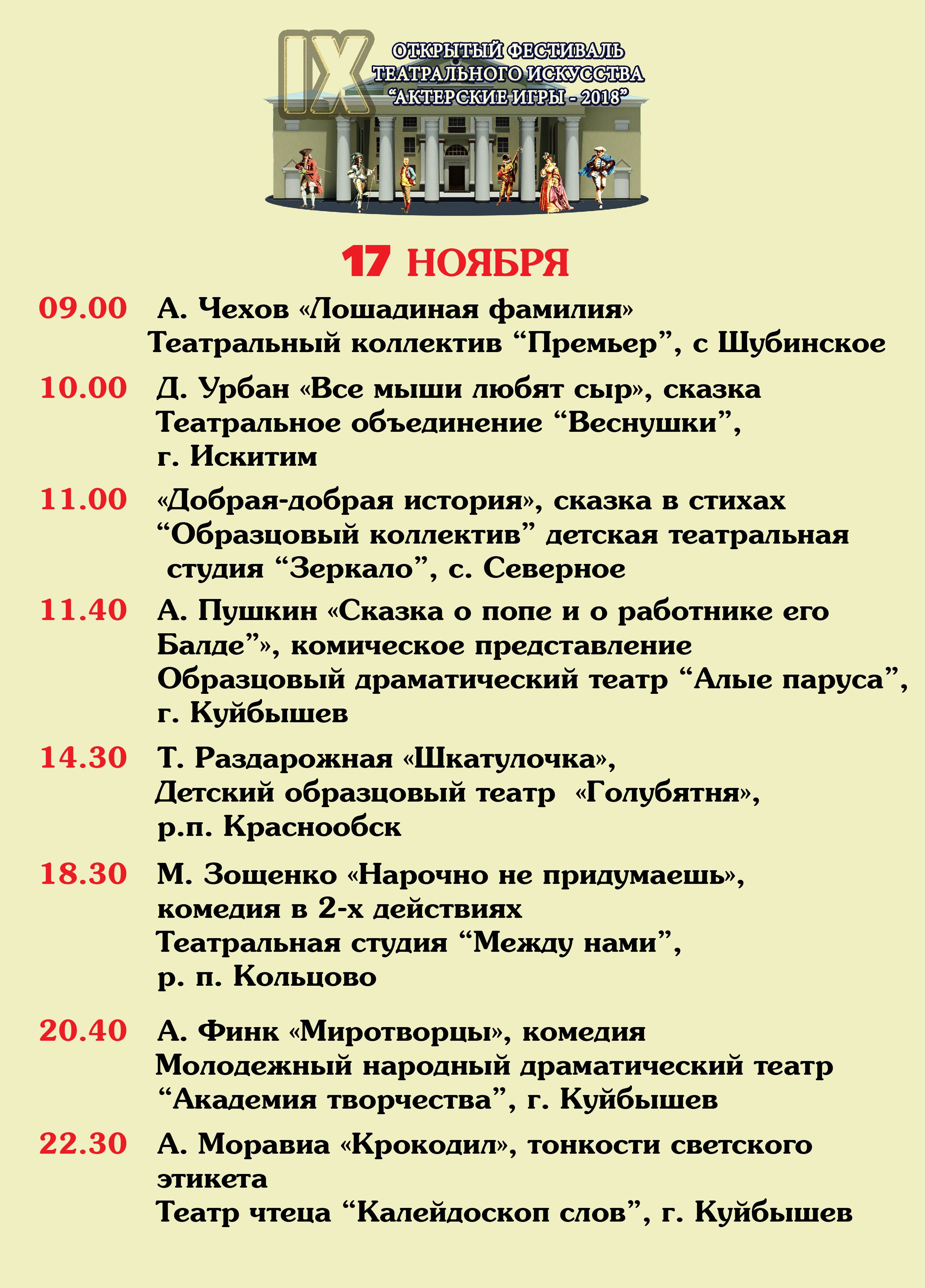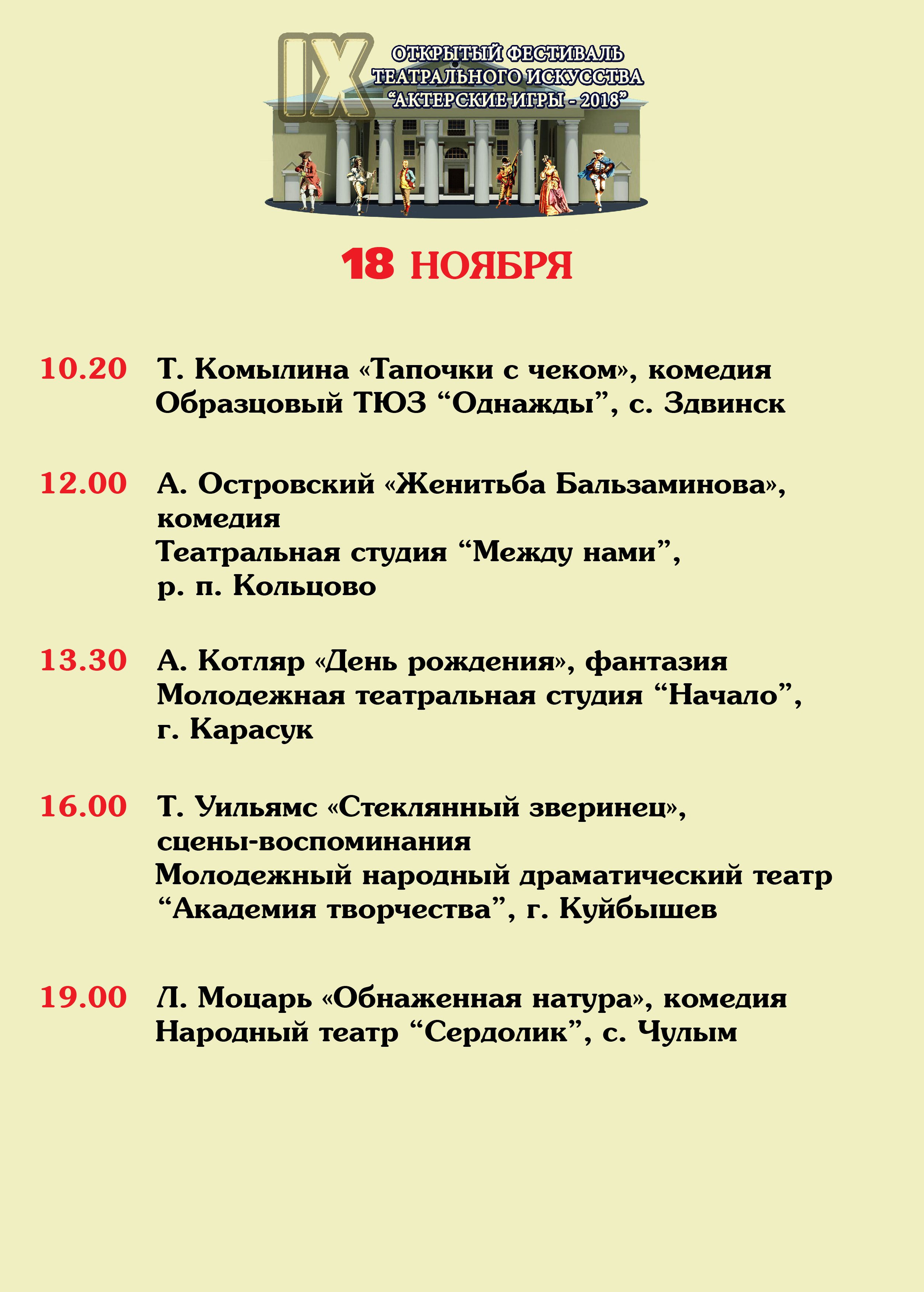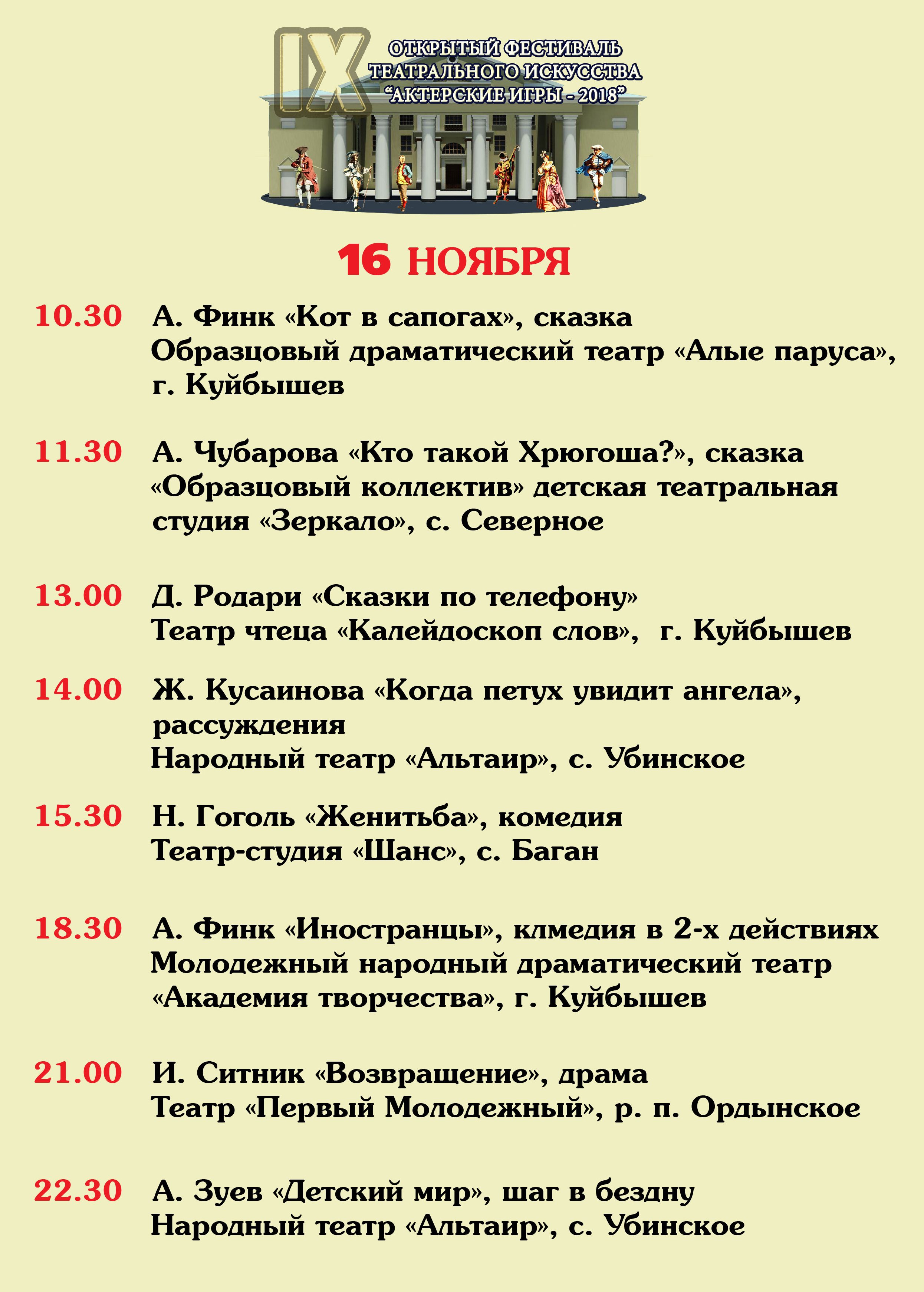 С 16 по 18 ноября идет IX Открытый фестиваль театрального искусства «Актерские игры – 2018» в Куйбышеве. На творческих площадках ДК для зрителей сыграют 23 спектакля.
