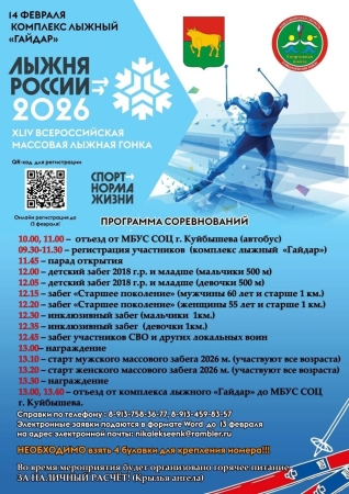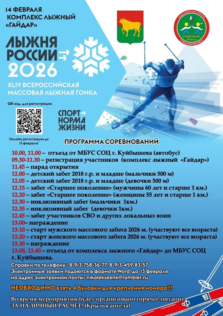14 февраля в Куйбышевском районе пройдёт XLIV Всероссийская массовая лыжная гонка «Лыжня России-2026». Местом большого спортивного праздника станет лыжный комплекс «Гайдар» (деревня Сартаково).