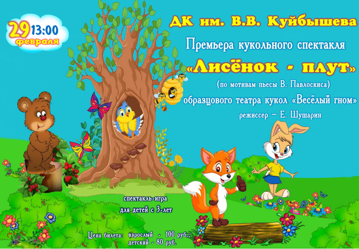 29 февраля в 13.00 состоится кукольный спектакль “Лисенок-плут” в ДК им. Куйбышева.