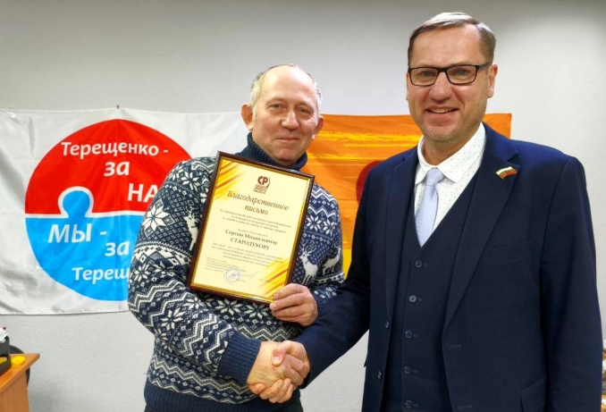 Депутат Законодательного Собрания (Справедливая Россия) Константин Терещенко вручил барабинским энтузиастам Благодарственные письма от Депутата Госдумы Александра Аксёненко.