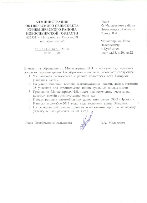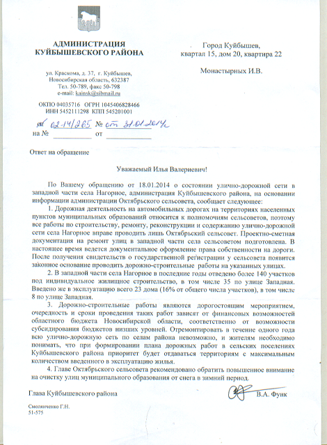 Обращения к главам Октябрьского сельсовета и районной администрации результата не дали. Из администрации района ему пришел ответ, что приоритет станет отдаваться дорогам на тех улицах, на которых больше всего домов введено в эксплуатацию. Поэтому мужчина написал обращение в прокуратуру.