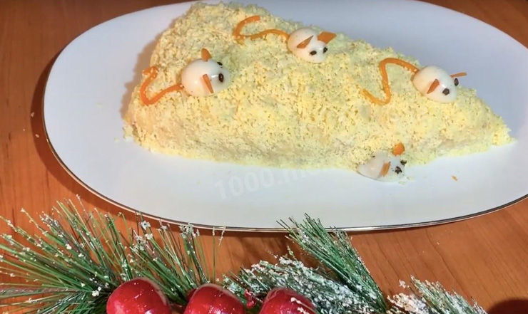 По желанию, можем сверху посыпать свежей зеленью или сыром. Салату, посыпанному сыром, придаем форму хозяйки года – крыски или снежной горки, или зимних сугробов.
