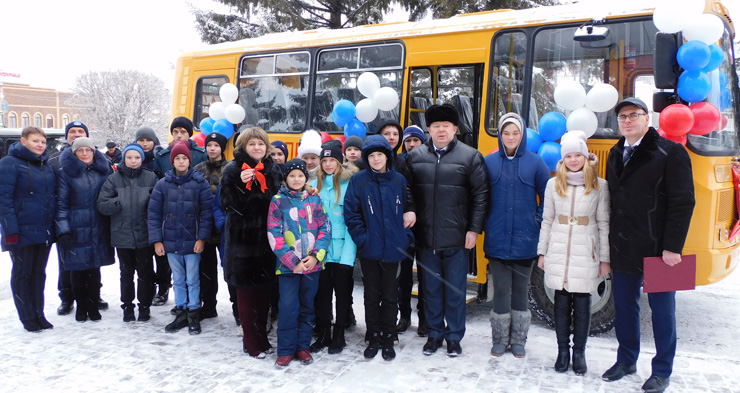 Вручение школьного автобуса марки ПАЗ на 22 посадочных места состоялось 13 декабря. Ключи от автобуса директору школы вручил член Совета Федерации Федерального Собрания Российской Федерации Владимир Лаптев.