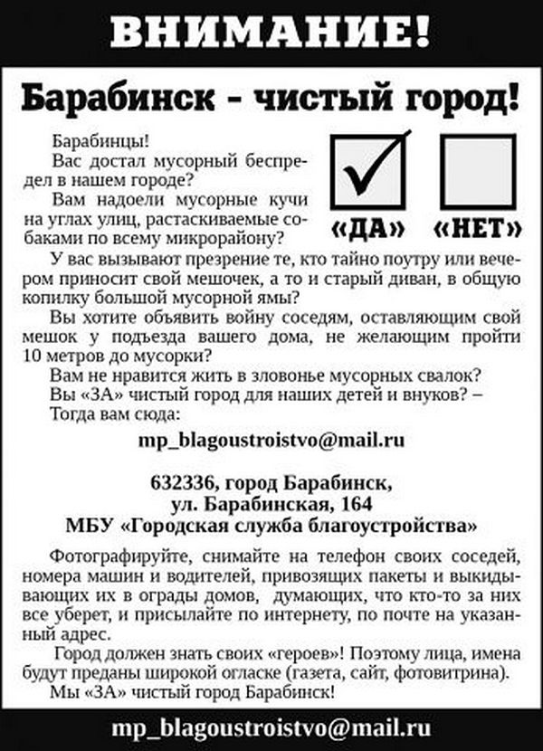 Как считаете, если станут публиковать фотографии барабинцев, замусоривающих улицы, станет ли город чище?