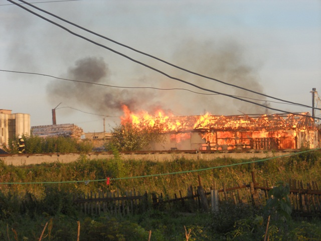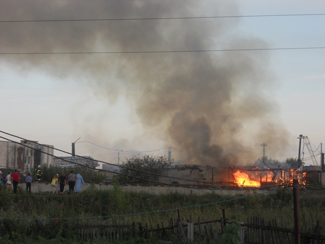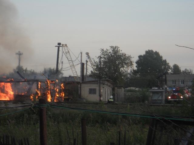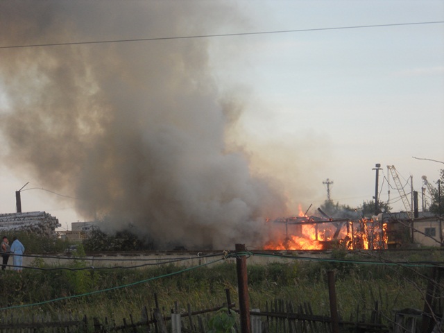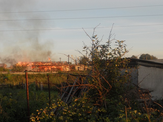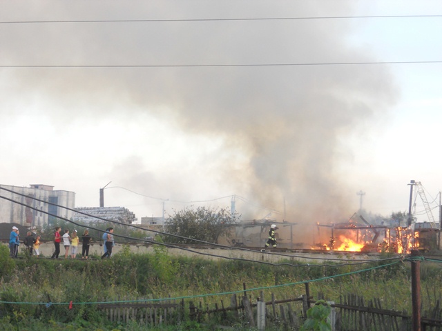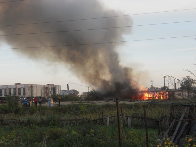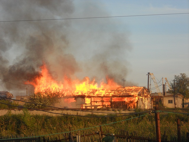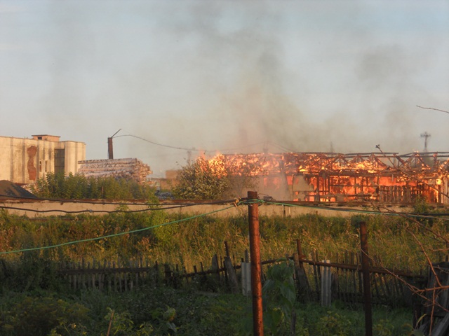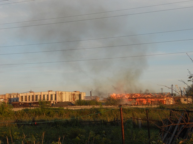 Оказалось, что горит помещение пилорамы, что находится рядом с поселком. Сильный треск издавал разом загоревшийся шифер на крыше. Подходить близко было опасно – осколки шифера разлетались на несколько метров.