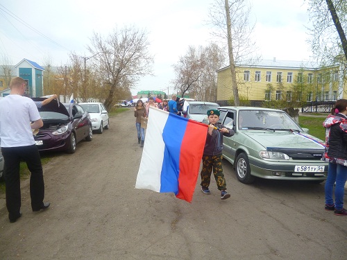 В этом году организованная колонна из 14 машин проехала по улицам Барабинска. Каждая была украшена российскими флагами, все участники с георгиевскими ленточками. Один из них нарисовал на своем авто танк и написал “Спасибо деду за Победу”.