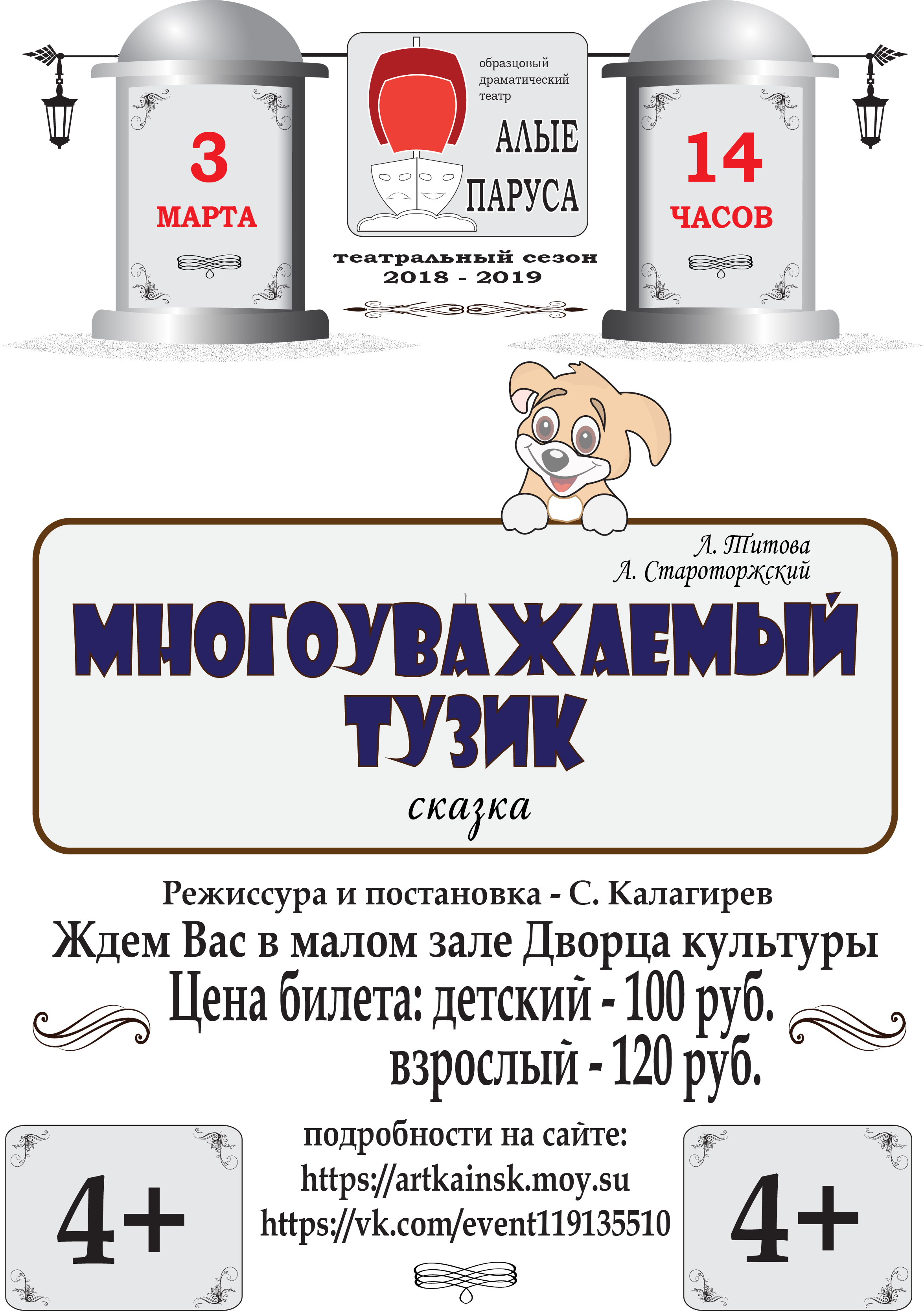 Режиссер Сергей Калагирев с образцовым драматическим театром “Алые паруса” приглашает на сказку “Многоуважаемый Тузик” в ДК им. Куйбышева 3 марта.