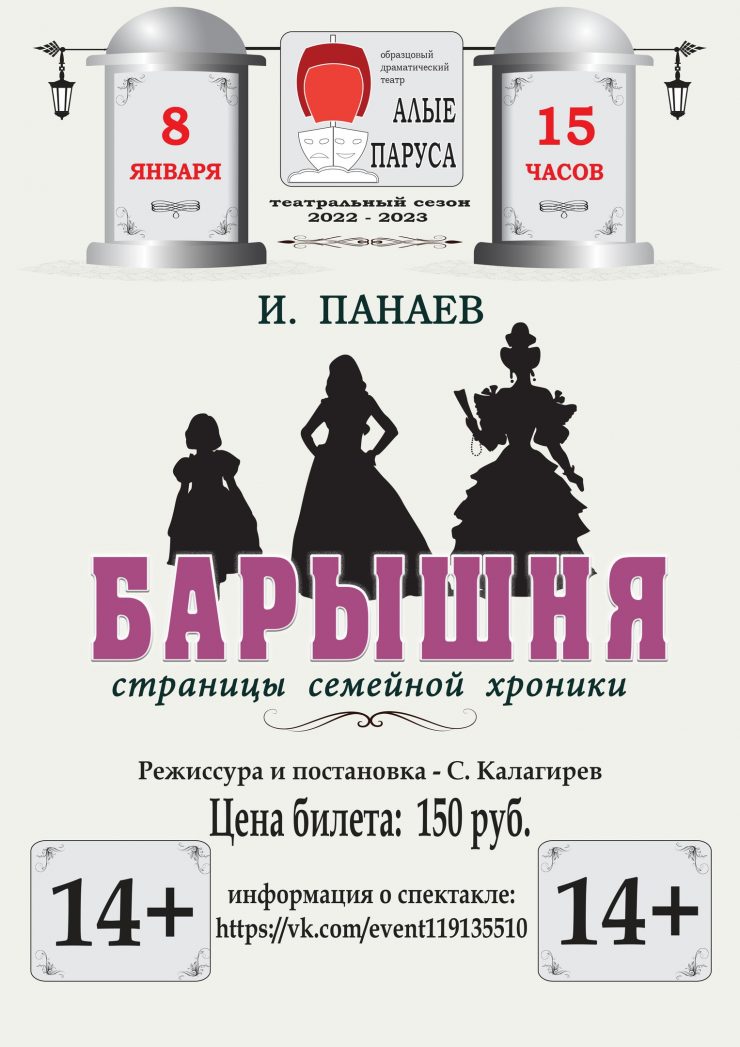 Куйбышевцев и гостей города приглашают во Дворец культуры на спектакль “Барышня” 8 января в 15.00 часов.