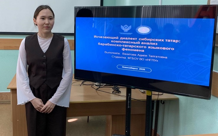 С сообщением выступила носитель барабинско-татарского языка, студентка НГПУ Адиля Вахитова. Она рассказала, что в ее поселении Аул-Бергуль Куйбышевского района сохраняется барабинско-татарский язык – особый лингвистический феномен. В этом языке до сих пор живы долгие гласные, и в нём нет привычной татарской звонкости. Для 8 000 коренных жителей Барабы это не вопрос классификации – это вопрос идентичности.