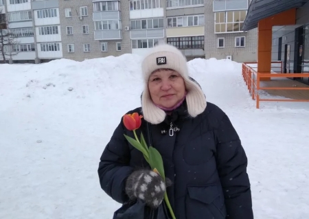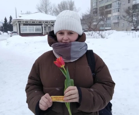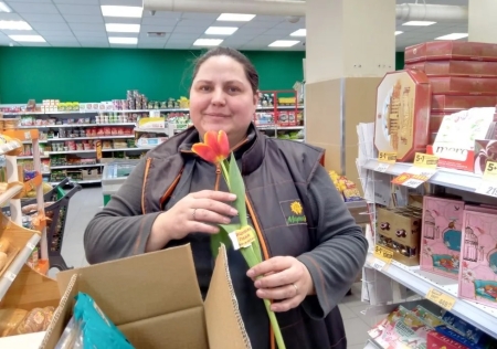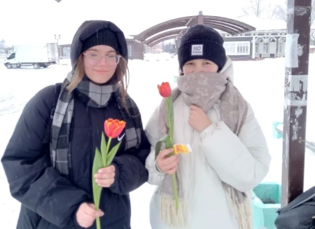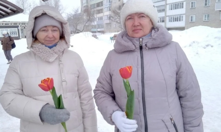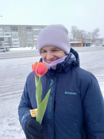 Ярко-красные тюльпаны раскрасили зимнюю улицу в цвет праздника, желтые стикеры на цветах заменили луч солнца в пасмурный день, а улыбки милых дам одарили окружающих теплом.
