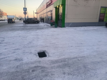 На улице Пушкина в Барабинске — возле магазина «Пятёрочка», там, где дорога делает мягкий спуск к стоянке машин, — на асфальте распахнулось опасное отверстие, будто маленькая бездна, которая появилась тихо, незаметно, но может шумно заявить о себе.