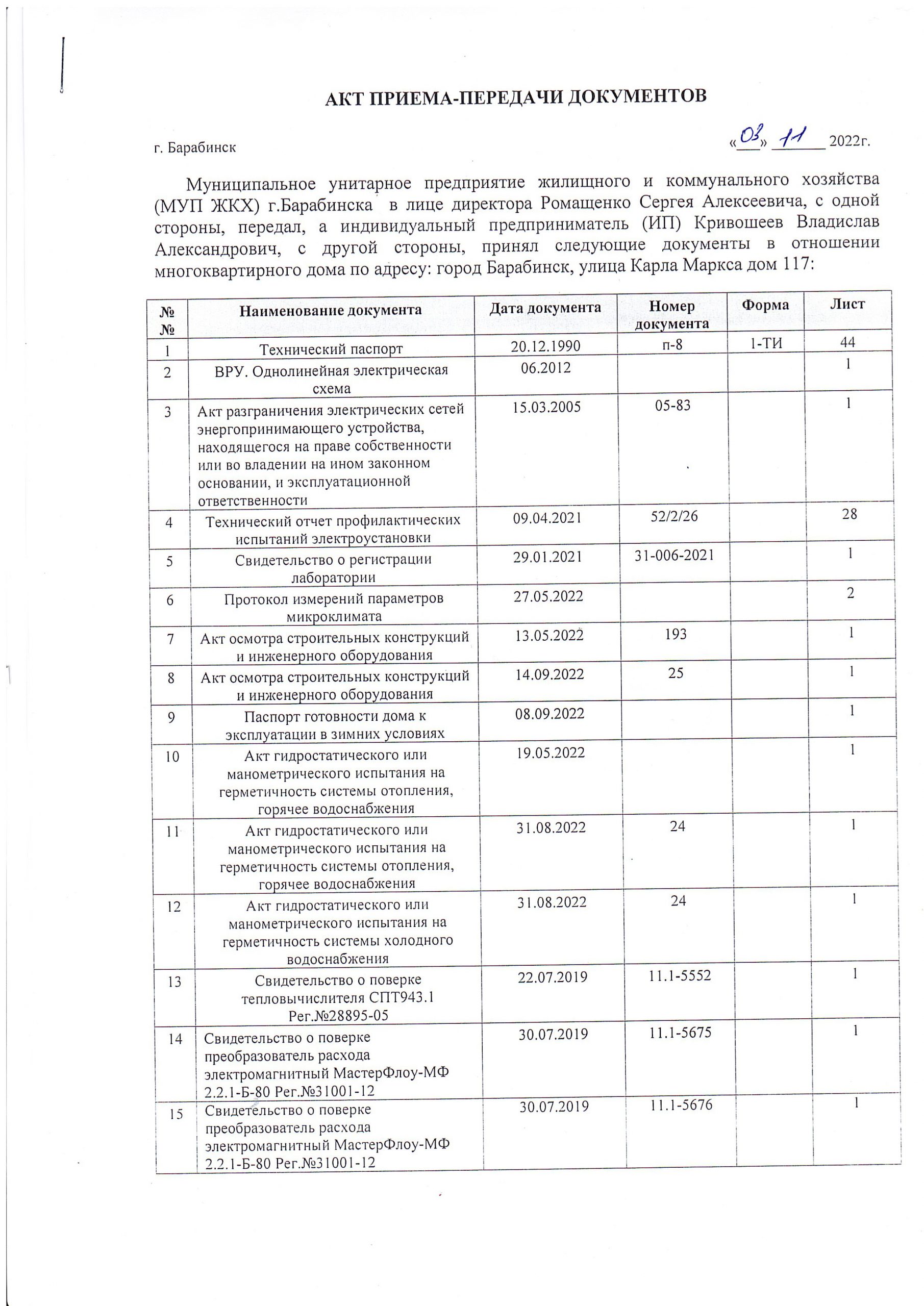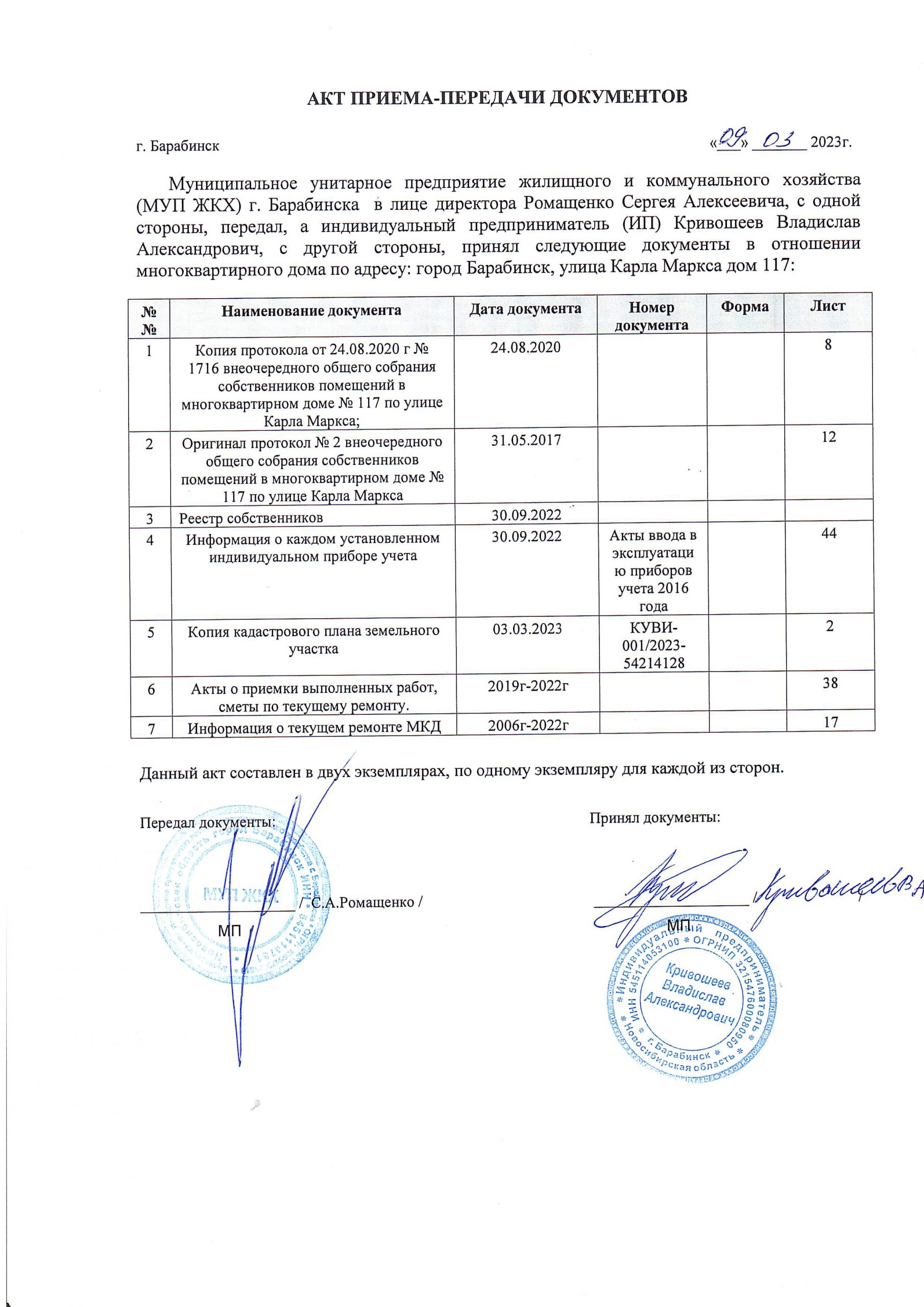 За неделю до приезда телевизионной группы УК «МУП ЖКХ» предоставила новой УК «Уютный дом» те документы, которые они ждали 5 месяцев. Директор МУП ЖКХ Сергей Ромащенко всех убеждал, что документы давно передал новой УК, но, если посмотреть акт передачи от 03.11.2022, то видно, что те документы, которые были переданы ранее, не относятся к заключению договоров. Нужные документы от прежней УК, из которой ушли жильцы дома по улице К. Маркса, 117 были получены новой УК только 09.03.2023 года.
